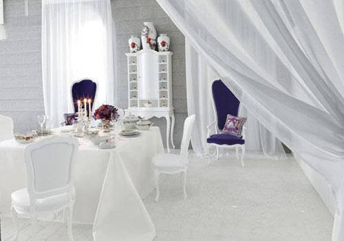 餐桌远端摆放实木扶手椅Queen Dotsenko:白色上漆结构,软包椅面和靠背外覆蓝色天鹅丝绒面料。参考价格60000元。餐桌上摆放与Rosenthal合作生产的手绘陶瓷餐具Flower Fantasy。价格580元起。