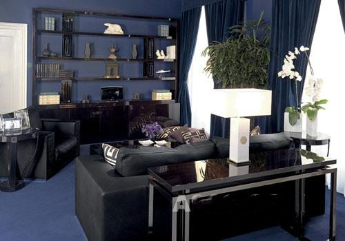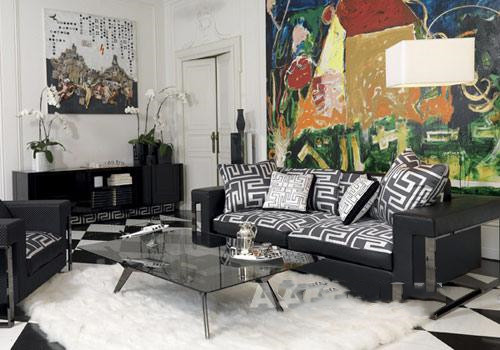 黑色真皮沙发Lomond系列,带有范思哲品牌的标志性图案,参考价格150000元。圆形茶几采用实木底座,黑色水晶玻璃桌面,参考价格80000元。长条案Dedalo使用金属结构,水晶玻璃桌面,参考价格40000元。