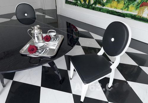 餐椅Audrey,白色上漆结构,黑白两色真皮椅面和靠背,参考价格26500元。餐桌New York上摆放着同Rosenthal合作生产的餐具。