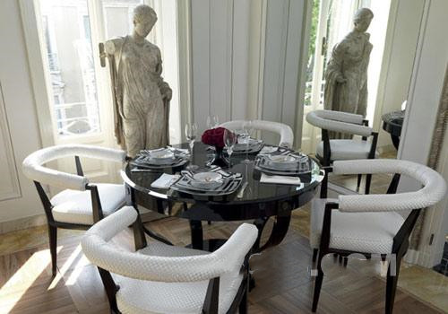 范思哲家居产品营造的传统氛围:餐桌New York采用实木底座,镶嵌珍珠母作为装饰。参考价格120000元。餐椅Tunnel,使用手编真丝面料。参考价格42000元。