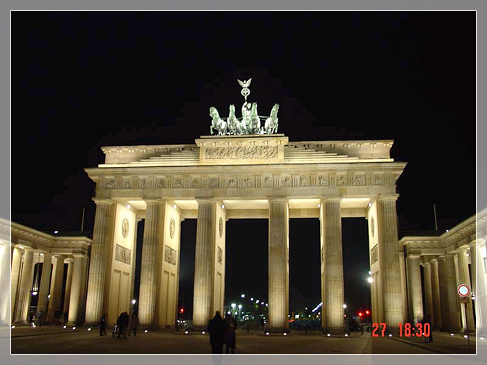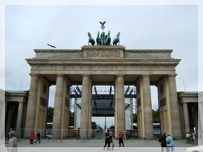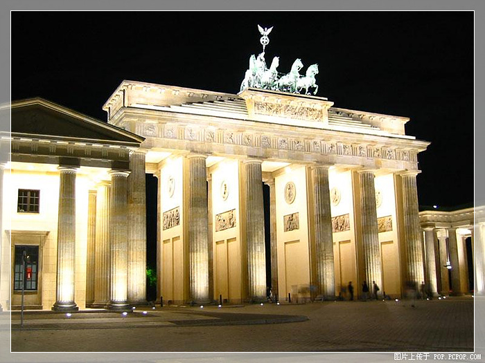 德国 勃兰登堡门,位于德国首都柏林的市中心,最初是柏林城墙的的一道城门,因通往勃兰登堡而得名。现在保存的勃兰登堡门是一座新古典主义风格的建筑,由普鲁士国王腓特烈·威廉二世下令于1788年至1791年间建造,以纪念普鲁士在七年战争取得的胜利。自滑铁卢战役以后,勃兰登堡门逐步成为柏林的象征,也是德国国家的标志。