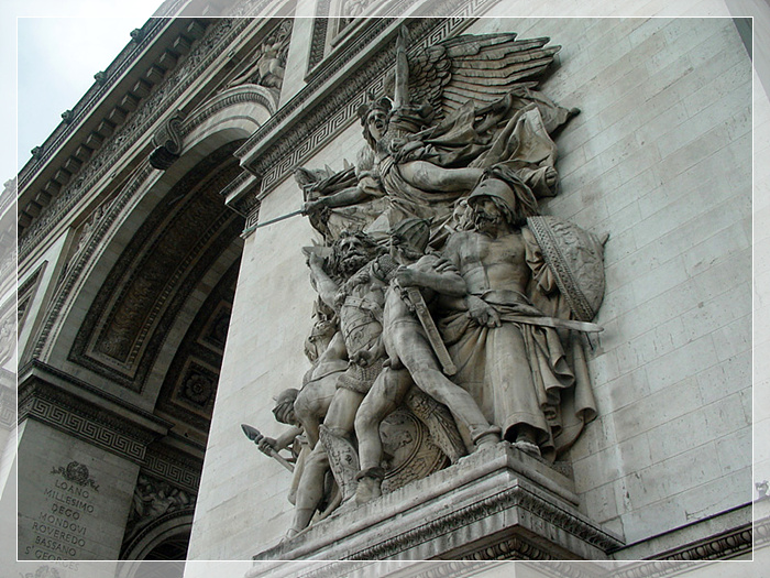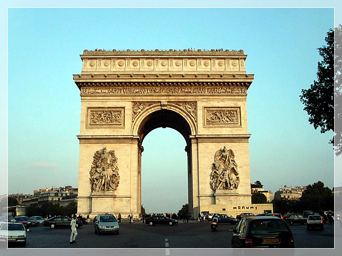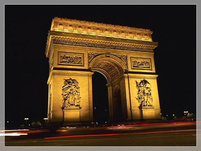 凯旋门,巴黎著名建筑物。位于市西夏尔·戴高乐广场。为纪念拿破仑在奥斯特里茨战役中打败俄、奥联军,于1806年始建, 1836年落成。高49.54米,宽44.82米,厚22.21米。四面有门,中心拱门宽14.6米。外墙上有巨型雕像,以刻在右侧石柱上的《出征》浮雕最著名。门内侧刻有曾跟随拿破仑出征的386名将军的名字。门下有无名战士墓,并设有“长明火炬”,以资纪念。12条林荫大道从广场辐射延伸,使凯旋门更形雄伟壮观。
