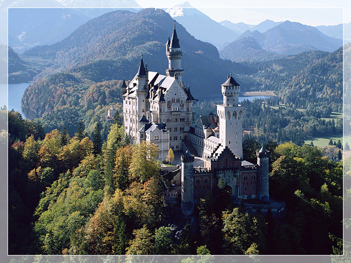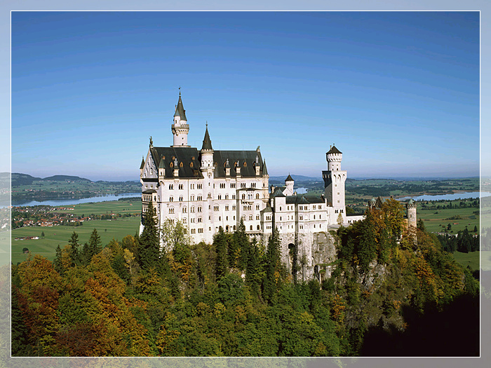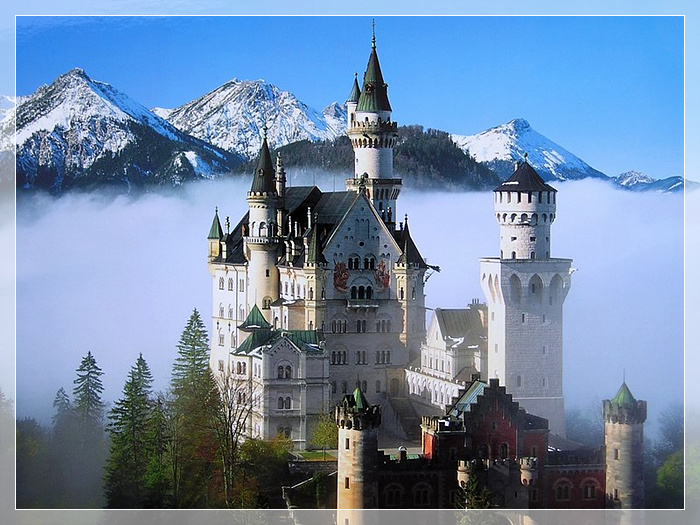 新天鹅城堡,又名“白雪公主城堡”,是座白墙蓝顶的神话城堡,坐落于于德州Fussen小镇上,在阿尔卑斯山脉中,始建1869年。建立者是巴伐利亚的一个国王,路德维希二世。这个皇帝无治世之才,却充满艺术气质。他亲自参与设计这座城堡由于白色城堡耸立在高高的山上,其四周环山和湖泊。所以一年四季,风光各异。它是真实的童话!
