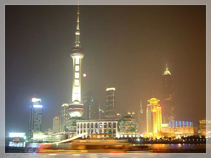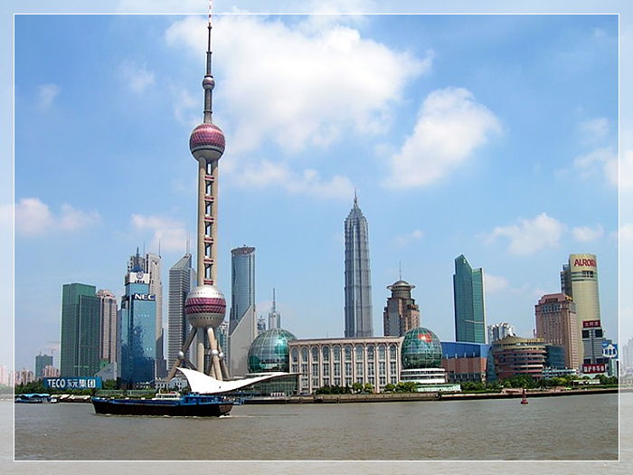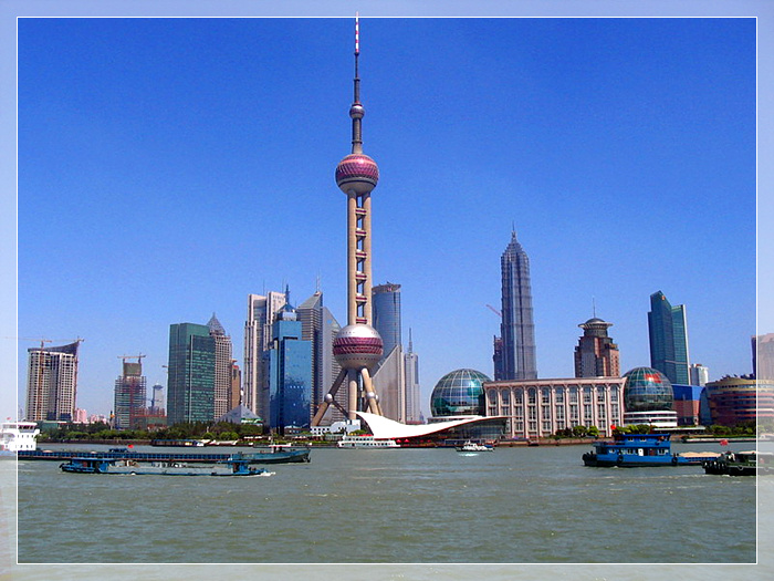东方明珠,东方明珠广播电视塔坐落于黄浦江畔浦东陆家嘴嘴尖上,与外滩的万国建筑博览群隔江相望。塔高468米,是亚洲第二高塔,也是世界第四高塔。设计者富于幻想地将十一个大小不一、高低错落的球体从蔚蓝的空中串联到如茵的绿色草地上。与塔下新落成的世界一流的上海国际会议中心的两个地球球体,构成了充满“大珠小珠落玉盘”诗情画意的壮美景观。