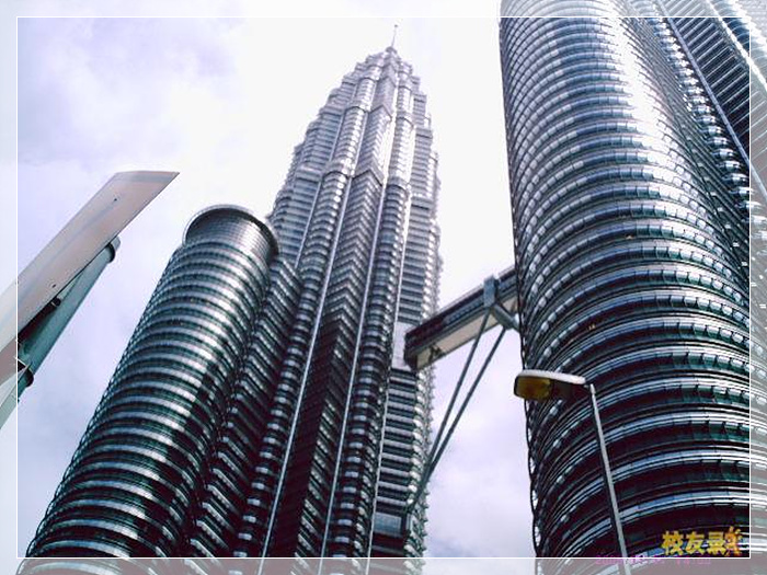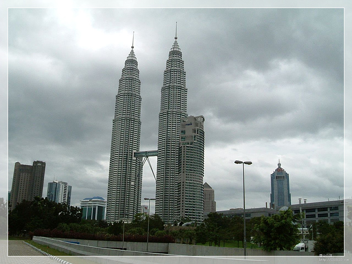 双子塔,是吉隆坡的标志性城市景观之一,是世界上目前最高的双子楼和第四高的建筑物。是马来西亚经济蓬勃发展的象征。值得一提的特色是在第42层处的天桥。这座有人字形支架的桥似乎像一座登天门。双塔的楼面构成以及其优雅的剪影给它们带来了独特的轮廓。其平面是两个扭转并重叠的正方形,用较小的圆形填补空缺;这种造型可以理解为来自伊斯兰的灵感,而同时又明显是现代的和西方的。