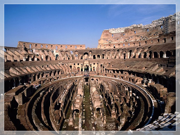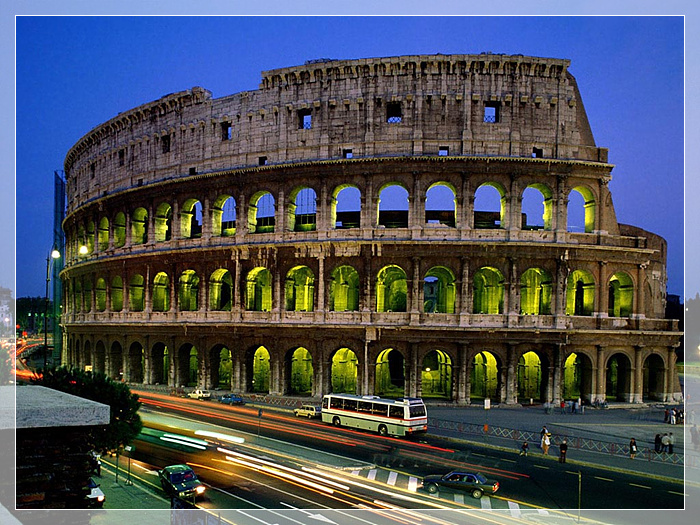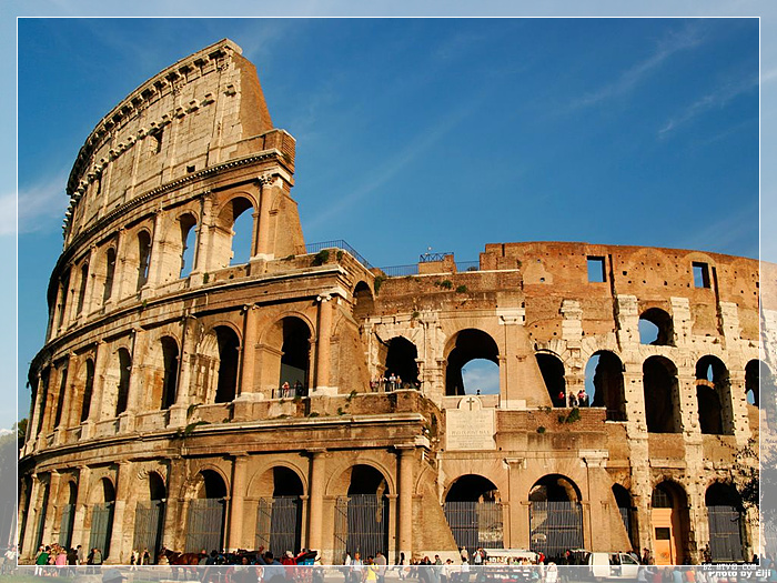 罗马斗兽场,建于公元72至82年间,遗址位于意大利首都罗马市中心,它在威尼斯广场的南面,古罗马市场附近。从外观上看,它成正圆形;俯瞰时,它是椭圆形的。它的占地面积约2万平方米,大直径为188米,小直径为156米,圆周长527米,围墙高57米,可以容纳近九万人数的观众。围墙共分四层,前三层均有柱式装饰,依次为多立克柱式、爱奥尼柱式、科林斯柱式。斗兽场专为野蛮的奴隶主和流氓们看角斗而造。