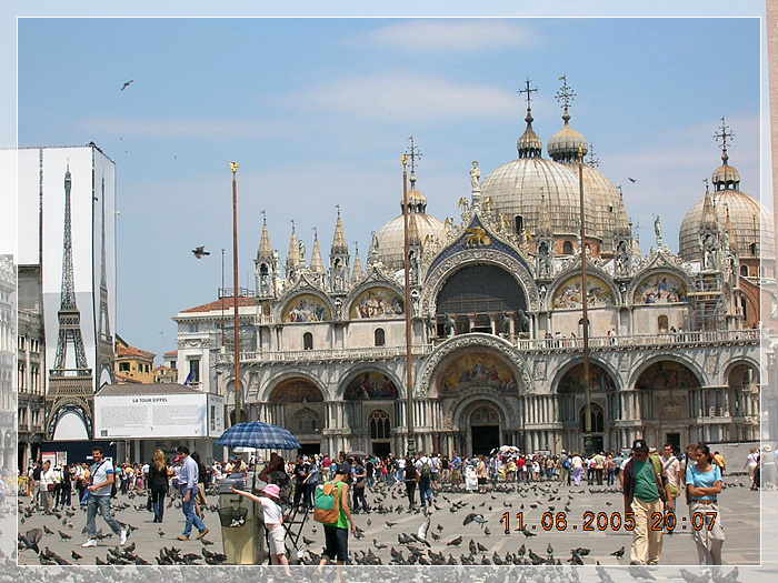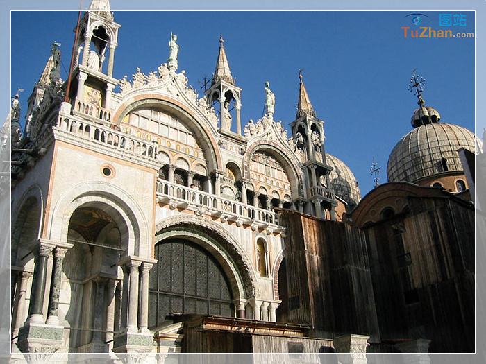 圣马可大教堂,矗立于威尼斯市中心的圣马可广场上。始建于公元829年,重建于1043~1071年,据说其中埋葬了耶稣门徒圣马可而得名。它曾是中世纪欧洲最大的教堂,是威尼斯建筑艺术的经典之作,它同时也是一座收藏丰富艺术品的宝库。教堂又被称之为“金色大教堂”。圣马可教堂不许穿无袖或短裤入内。