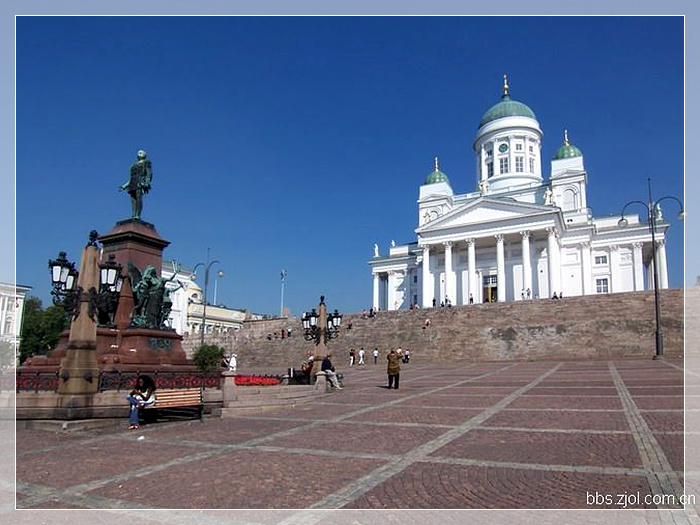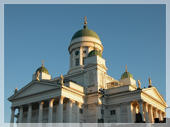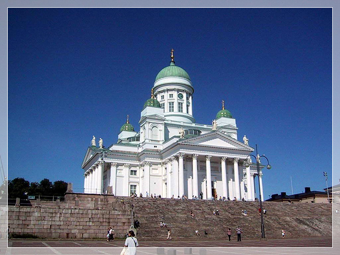 赫尔辛基大教堂,建于1852年,出自德国建筑师恩格尔之手。一眼望去,希腊廊柱支撑的乳白色教堂主体和淡绿色青铜圆顶的钟楼十分醒目,宏伟的气势和精美的结构使其成为芬兰建筑史上的经典,也成为赫尔辛基市的地标性建筑。芬兰情侣都希望在这里举行婚礼,为此甚至需要提前一年半预约。而北欧最好的大学之一——赫尔辛基大学的神学院毕业典礼,每年也都选择在这里举行。