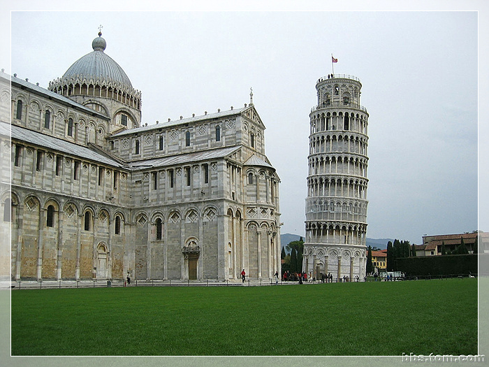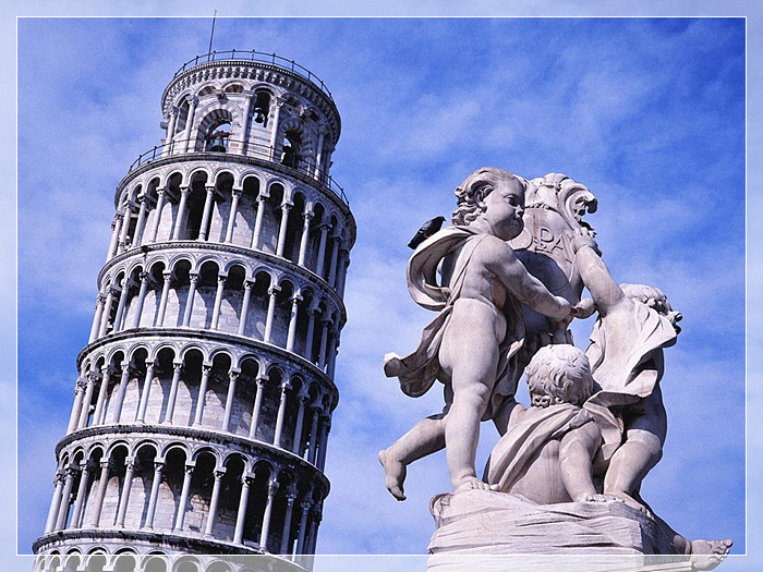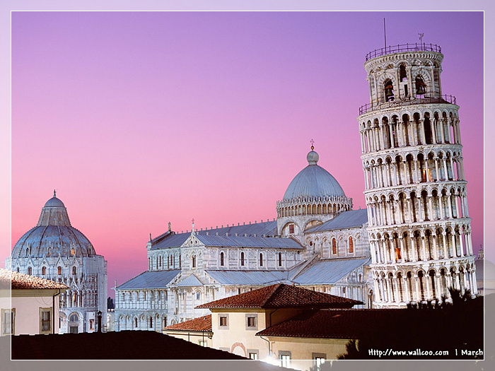意大利 比萨斜塔,位于意大利托斯卡纳省比萨城北面的奇迹广场上。始建于1173年,设计为垂直建造,但是在工程开始后不久便由于地基不均匀和土层松软而倾斜,1372年完工,塔身倾斜向东南。比萨斜塔是比萨城的标志,1987年它和相邻的大教堂、洗礼堂、墓园一起因其对11世纪至14世纪意大利建筑艺术的巨大影响,而被联合国教育科学文化组织评选为世界遗产。