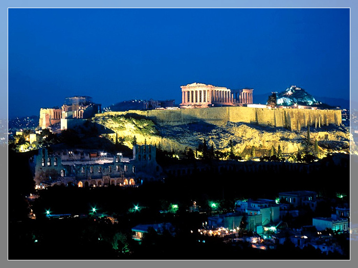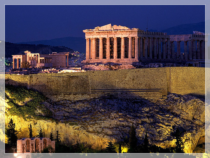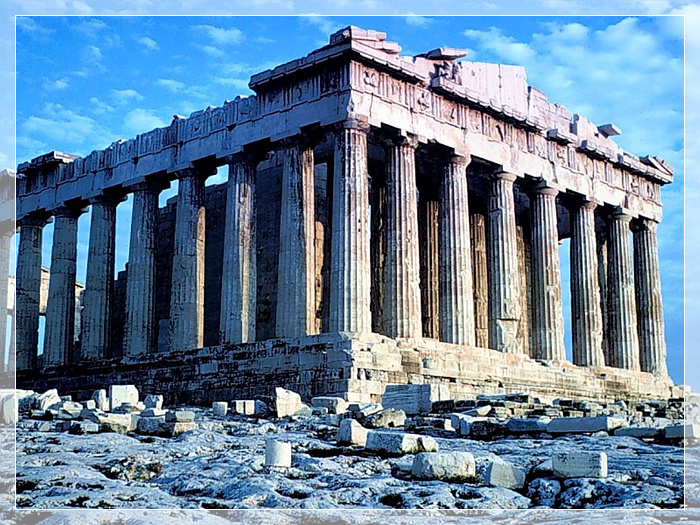 帕特农神庙, 雅典卫城主体建筑,为歌颂雅典战胜波斯侵略者的胜利而建。帕特农神庙是供奉雅典娜女神的最大神殿。此庙不仅规模最宏伟,坐落在卫城中央最高处,庙内还存放一尊黄金象牙镶嵌的全希腊最高大的雅典娜女神像。这座神庙历经两千多年的沧桑之变,如今庙顶已坍塌,雕像荡然无存,浮雕剥蚀严重,但从巍然屹立的柱廊中,还可以看出神庙当年的丰姿。