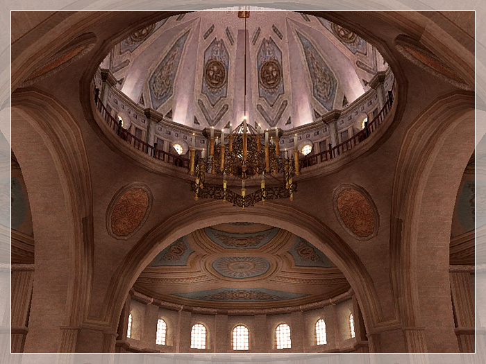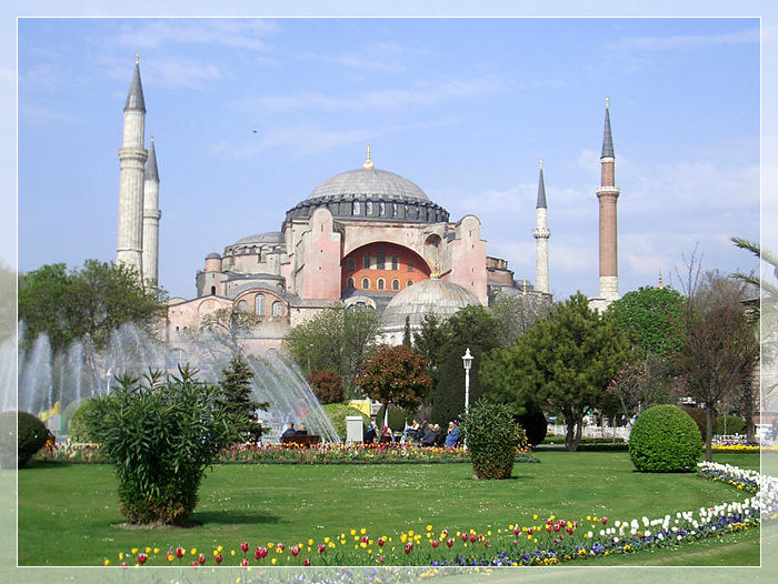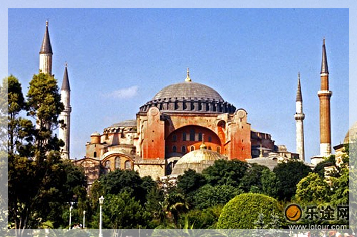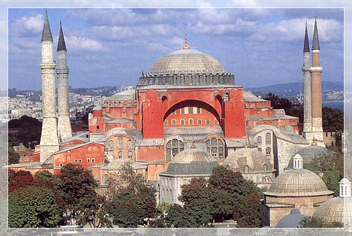圣索菲亚教堂,作为君士坦丁堡(土耳其伊斯坦布尔旧称-译注)的主教堂,圣索菲圣大教堂在拜占庭帝国中起着重要作用,所有的帝王都在那里加冕。是遵照拜占庭帝国最伟大的皇帝之一---查士丁尼的命令建造的。他编纂了帝国法律,并重新征服了过去的西方帝国,当圣索菲亚大教堂完工时,历史学家普罗科匹厄斯写道,教堂的穹顶看起来好像没有基座,仿佛是靠一条金链悬挂在天堂上。