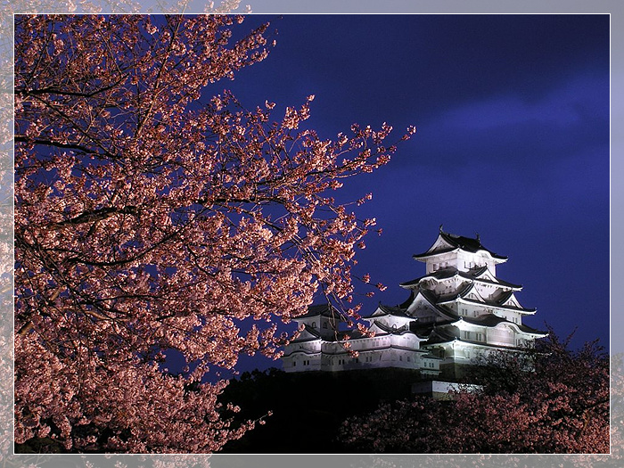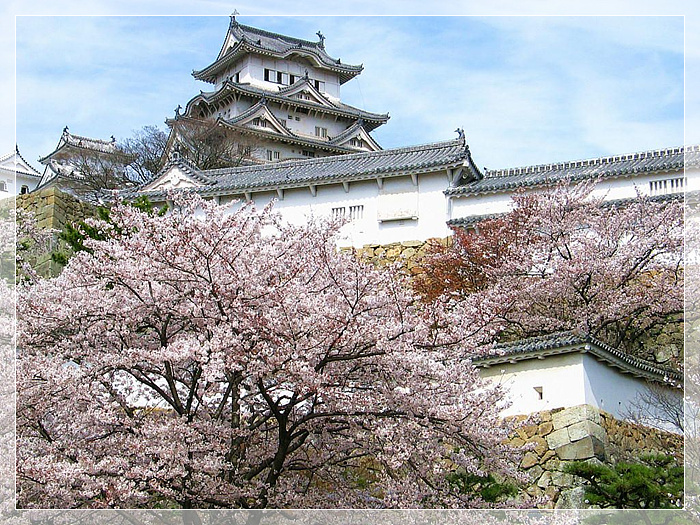 姬路城,城堡建造在海拔45.6米的姬山之颠,主要城郭(天守阁)高31米,城堡外形好似一只高雅的白鹭,所以又称白鹭城,是日本现存的古代城堡中规模最宏大,风格最典雅的一座代表性城堡。春天有姬路城赏樱会“花见太鼓”、千姬牡丹节,夏天有姬路“港口节”,秋天有姬路城赏月会,冬天有姬路全国陶器展等,一年四季游客不断。