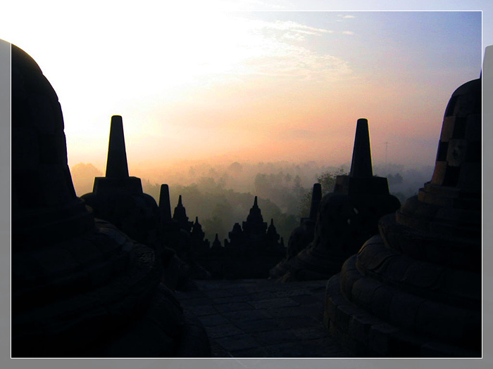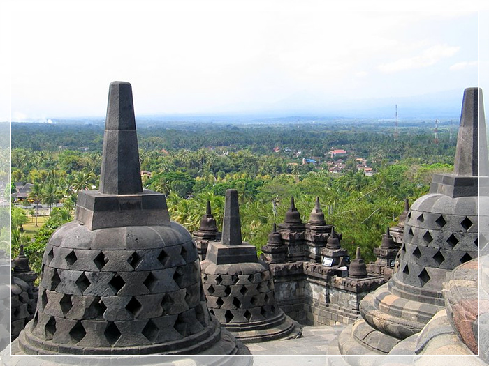 婆罗浮屠,举世闻名的佛教千年古迹,位于印度尼西亚爪哇岛中部马吉冷婆罗浮屠村,在默拉皮火山山麓一个长 123 米、宽 113 米、呈矩形的小山丘上。关于佛塔有不少美丽的传说。一说如果你能将手从孔洞中伸进去摸到佛像的手掌,那你将福星高照,隆运亨通;又传说那些石雕怪兽和佛像可以避邪,于是引来不少游客顶礼膜拜,祈求平安和幸福。