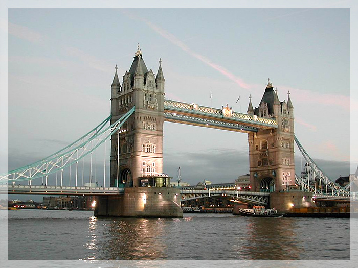 伦敦塔桥,是从英国伦敦泰晤士河口算起的第一座桥(泰晤士河上共建桥15座),也是伦敦的象征,有“伦敦正门”之称。该桥始建于1886年,1894年6月30日对公众开放,将伦敦南北区连接成整体,塔桥两端由4座石塔连接, 两座主塔高35米。河中的两座桥基高7.6米,相距76米。登塔远眺,可尽情欣赏泰晤士河上下游十里风光。假若遇上薄雾锁桥,景观更为一绝,雾锁塔桥是伦敦胜景之一。