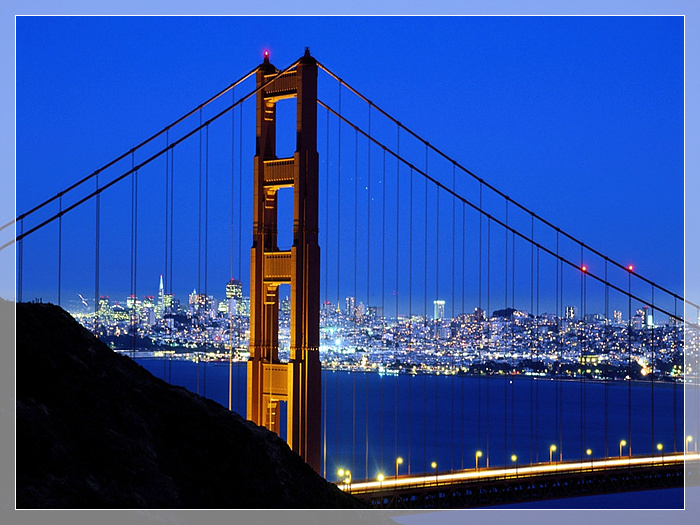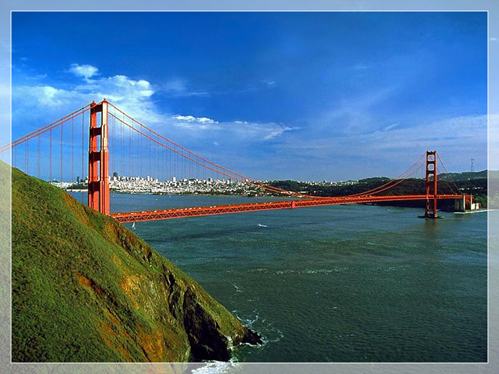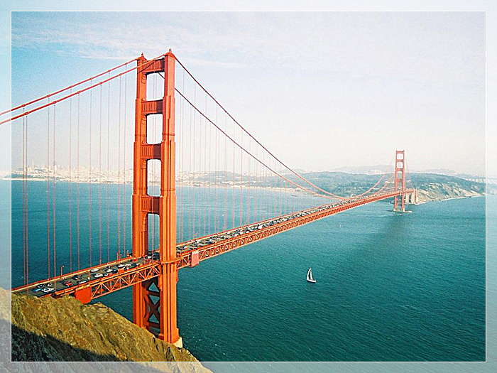 金门大桥,北端连接北加利福尼亚,南端连接旧金山半岛。金门大桥的巨大桥塔高227米,每根钢索重6412公吨,由27000根钢丝绞成。桥全长达2000米,为此,又分别在两侧修建了两座辅助钢塔,使桥形更加壮观。大桥的桥面宽27.4米,有6条车行道和两条宽敞的人行道。整个大桥造型宏伟壮观、朴素无华。桥身呈朱红色,横卧于碧海白浪之上,华灯初放,如巨龙凌空,使旧金山市的夜空景色更加壮丽。