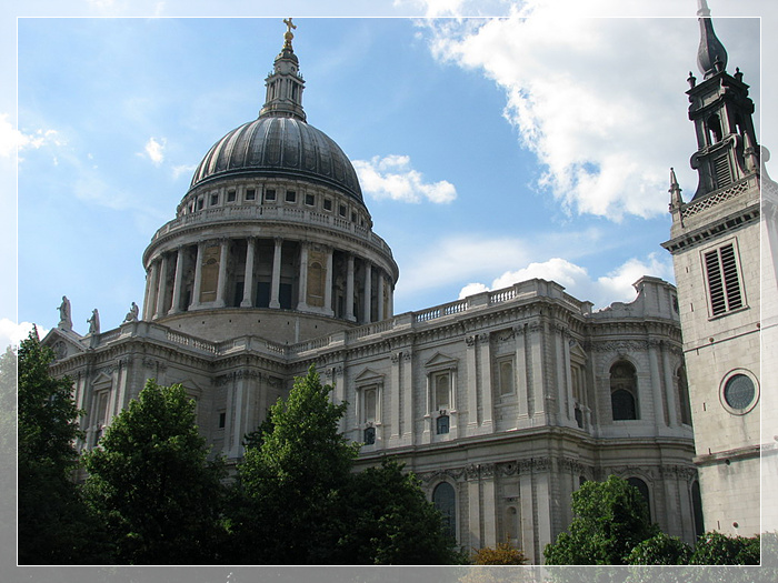 圣保罗大教堂,位于伦敦泰晤士河北岸纽盖特街与纽钱吉街交角处,巴洛克风格建筑的代表,以其壮观的圆形屋顶而闻名,是世界第二大圆顶教堂,它模仿罗马的圣彼得大教堂,是英国古典主义建筑的代表。最令人印象深刻的就是1981年黛安娜与查尔斯的婚礼大典,到现在仍然不减圣保罗大教堂对旅客的吸引力,因其整体建筑设计优雅、完美,内部静谧、安详。