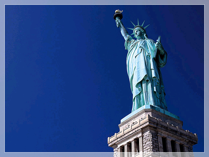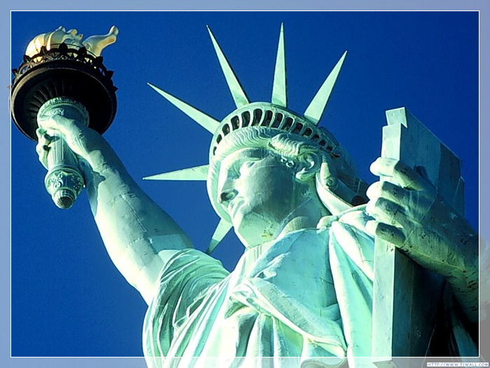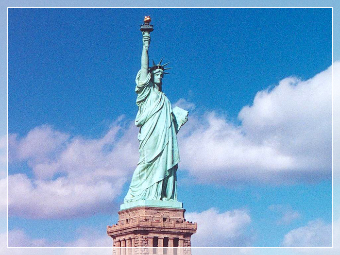 自由女神像,始建于1874年,1884年完工,材质:钢、铜。高46米(加基座为93米),重200多吨。是法国在1876年赠送给美国的独立100周年礼物,位于美国纽约市哈德逊河口附近。是雕像所在的自由岛的重要观光景点。她象征着自由、挣脱暴政的约束。1984年,自由女神像被列为世界文化遗产。