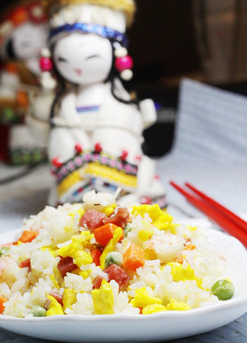 什锦蛋炒饭,是扬州炒饭中最典型的品种,它有很多配料,常用的有鸡蛋、海参、火腿、青豆、虾仁、猪里脊肉、香菇、笋、葱花等等。制作时先将鸡蛋炒好,再将其他配料炒熟,加清汤和盐调好味,盛起备用,然后开始炒米饭,米饭要炒得粒粒分明而没有湖斑,最后将炒好的鸡蛋和其它配料倒入一半炒匀,炒匀后盛出三分之二放在盘中,再将剩下的配料与锅中的米饭炒匀,盖在盘中的炒饭上。如此做出的炒饭既漂亮,又有很多配料在上面,真是好吃看得见啊!
