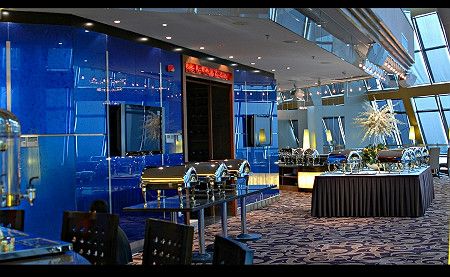餐厅身兼自助餐厅、西餐包房、酒吧多重空间,它能如此巧妙地将三者融合靠的不是别的,正是将玻璃墙面和背景灯光分别打造成几个不同的“世界”缘故。当灯光映照反射就会出现如梦似的色彩。摩天360西餐厅反映的是欧陆风格为主的美食,其主打菜为海鲜,自助餐台上展示着诸如生蚝、纽西兰青口贝、孔雀贝、鲜鱿鱼、大虾、阿拉斯加蟹腿、日本金枪鱼、三文鱼、玉带子等漂亮艳丽的美味,从西式佳肴到珍馐百味,无一不精心创新,给人非凡的视觉和味觉享受。