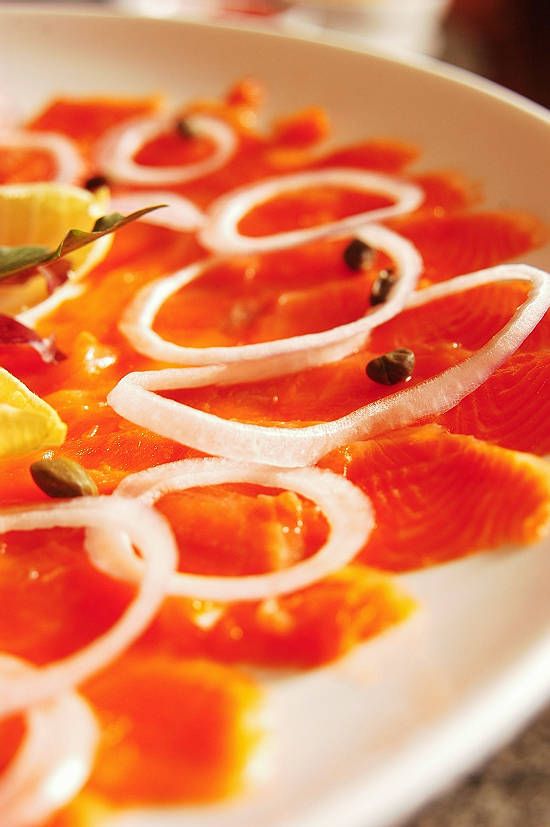全球出品三文鱼最好的地方应该是北欧的挪威了。挪威人用最先进的工业产出满坑满谷的三文鱼,据说每一道流程都严格监控,比野生的三文鱼更加健康。而且在宰杀时还讲一点人道主义:在0度左右的水温,鱼昏昏懒懒之时让它们基本无痛死,这时的鱼因为不紧张而身体放松,所以味道十分松软鲜美。亚洲人大都喜欢生食三文鱼,喜来登把来自挪威的三文鱼经调味后,腌制24小时后再进行烟熏,经熏制后的 三文鱼口感嫩滑,散发着独特的烟熏味道。