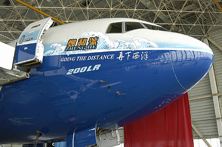 北京当今世界上航程最远的波音777-200LR今天在北京首都国际机场被正式命名为“郑和号”,以纪念伟大的中国航海家、探险家郑和下西洋600周年,这将是全球一系列盛大庆典活动的一部分。