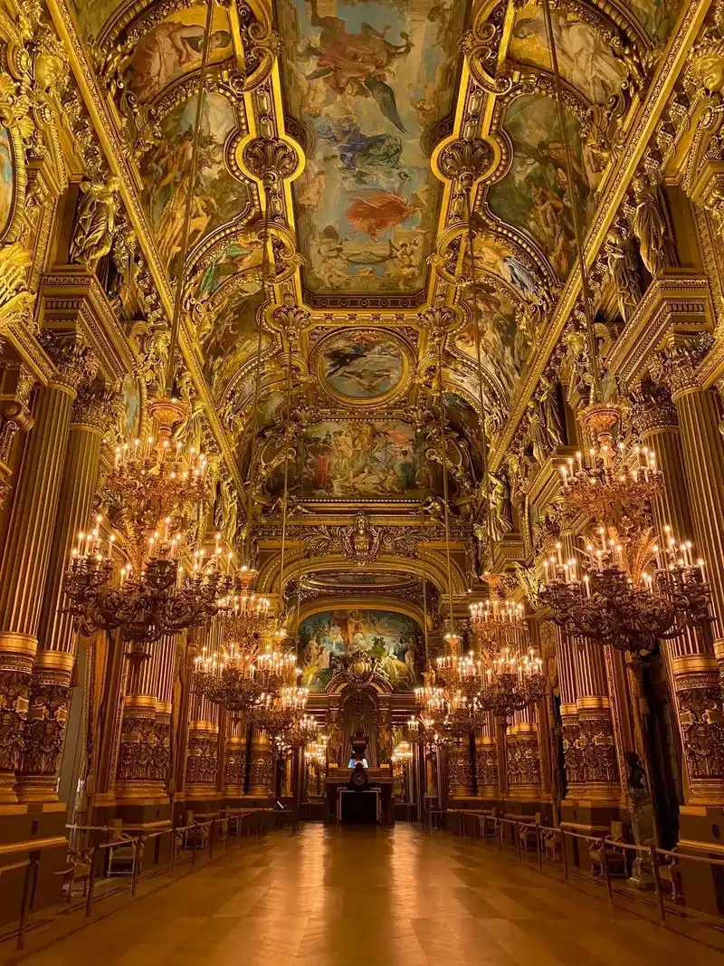 一进入歌剧院,马上就会被壮观的大楼梯吸引,大理石楼梯在金色灯光照射下更加闪亮,说法之一是被当时夜夜笙歌贵族仕女的裙衬擦得光亮,可见歌剧院当时盛况。大楼梯上方天花板则描绘着许多音乐寓言传奇故事。可从两侧进入歌剧院走廊,精美壮观程度不下大楼梯,加叶尼构想将大走廊设计类似古典城堡走廊,在镜子与玻璃交错辉映下,更与歌剧欣赏相得益彰。