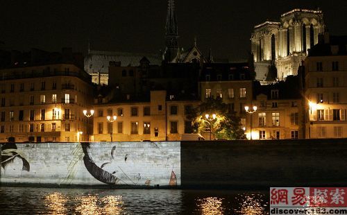 9月25日法国巴黎塞纳河边呈现出一副日本图画作品,该作品是为纪念法国-日本建交150周年所绘制的。作品通过投影仪射在了河边,意境悠远