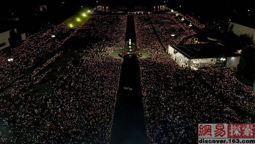 在葡萄牙法玛天主神殿,众多朝圣者手持蜡烛参加这一年一度的朝拜盛会