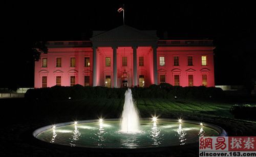 在乳腺癌防治月,世界超过200个国家的标志性建筑都亮起粉红色灯,加深人们对乳癌的重视,白宫也不例外,图为白宫粉红色的灯光