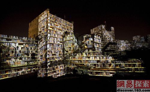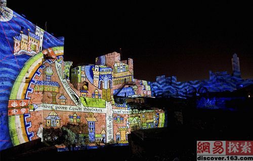 投影仪在耶路撒冷古城大卫城塔(Tower of David)的墙壁打造的书本图画