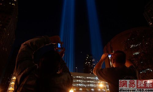 时值9.11恐怖袭击7周年之际,9月11日在纽约的世贸大厦遗址(Ground Zero)附近,摄影师们纷纷拍下这灯光盛景