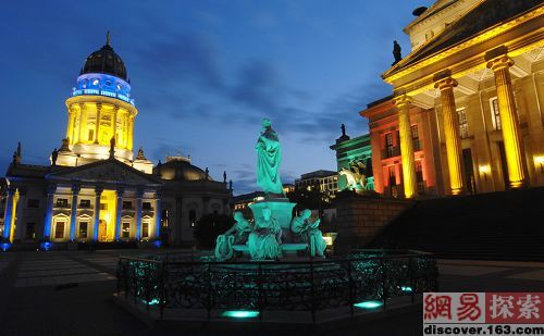 柏林的御林广场(Gendarmenmarkt)右边是音乐厅,左边是德国大教堂 (Deutscher Dom),在“灯节”预演上,完美的色彩搭配不得不让人为之大加赞赏