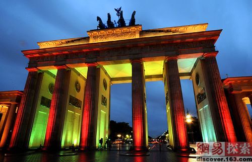 在10月16日的“灯节”上,著名的勃兰登堡门(Brandenburg Gate)在灯光的装扮显得无比雄伟