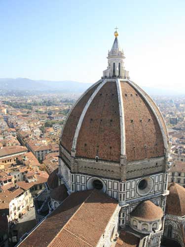 文艺复兴运动所遵从的宽容,赋予了圣母百花大教堂前所未有的姿态。即使在夜色中,圣母百花依旧浑身散发夺目的光晕,粉红、白与绿三色大理石的运用,使它成为众多教堂中令人最为过目难忘的艺术圣殿。同时,红、白、绿又与意大利国旗暗自相合,与浓重古朴的教堂相比,它无疑是时尚的。