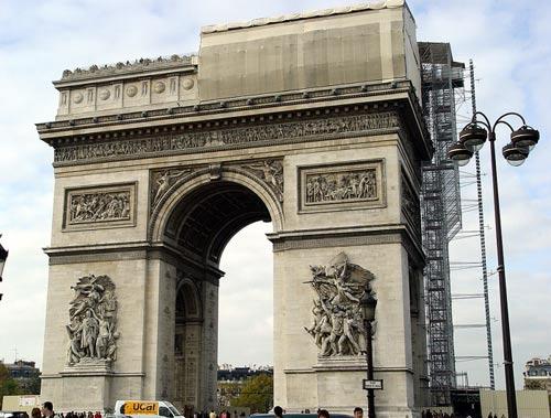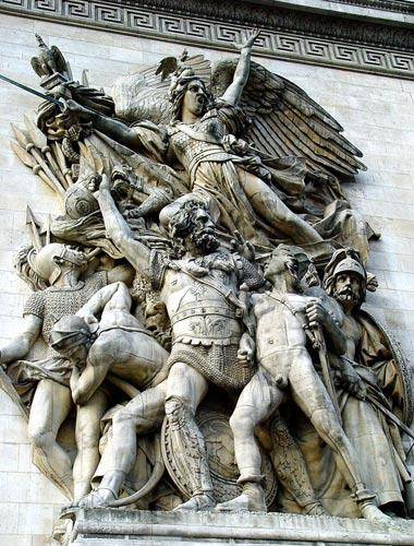 凯旋门雕塑《出征》。法国著名雕刻家弗朗索瓦·吕德设计,又称《1792年志愿军出发远征》,后来的法国国歌《马赛曲》就是由此产生的。这块浮雕在19世纪的法国以至世界雕刻史上,都有着重要地位。