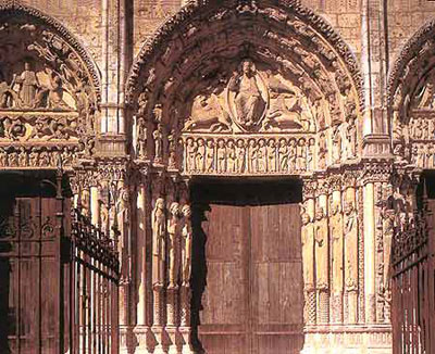 大教堂的西部正门入口是一组三扇深凹进去的尖拱大门,门侧原有24尊圆柱雕像,现保存有19尊。中门上有基督是万王之王的浮雕,因此有主门之名。大堂北侧大门旁的雕像是圣母和《旧约》中的人物。南侧大门旁的雕像则是耶稣一生得描绘和写照。