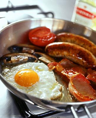 英式早餐:英国人认为早餐是一天中最重要的一顿饭。英式早餐已经超脱了“早餐”的原意,而是在更广的层面上代表了英国独特生活方式的一部分。一份英式早餐包括燕麦粥、煎蛋、烤番茄、蘑菇、茄汁黄豆、熏培根和烤香肠等。老式的传统英式早餐还包括了黑布丁[Black Pudding],是以猪血做的血肠。吃英式早餐,仅鸡蛋通常就有煎蛋,炒蛋,连壳煮和去壳煮四种烹调方法。英式早餐通常搭配英式早餐茶、咖啡和橙汁以及涂抹过黄油的烤面包片一同食用。除了英国传统的家庭旅馆,许多英国的饭店、酒吧和咖啡厅乃至大型超市的餐厅区里也供应英式早餐。价格在3-6镑左右。
