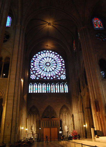 2.据说去巴黎圣母院最好从North Portal步入,一进门就能撞见绚丽夺目的3个玫瑰画窗。另外巴黎圣母院两边的商店也很有名气,可以买到很多精美的纪念品。