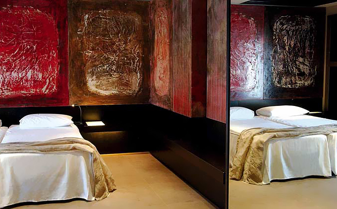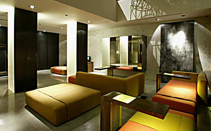 客房部分,纤细的弯曲台灯及与床头桌一体的发光板就像设计师使用手头的剩余材料临时组装出的照明代用件,却作为不变的装饰元素反复出现在不同房间中。温暖的光线配合寝具及窗帘的天然质感缓和过于工业化的材质给客人带来的生硬质感。在几间特殊的客房内还用有色玻璃开辟出独立空间,在那里可以进行光色疗法和熏香按摩。