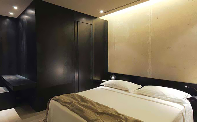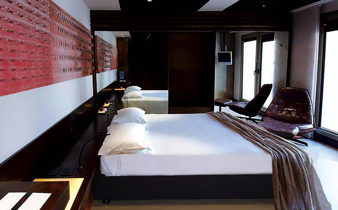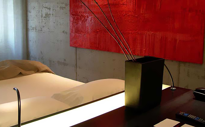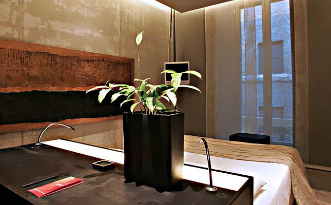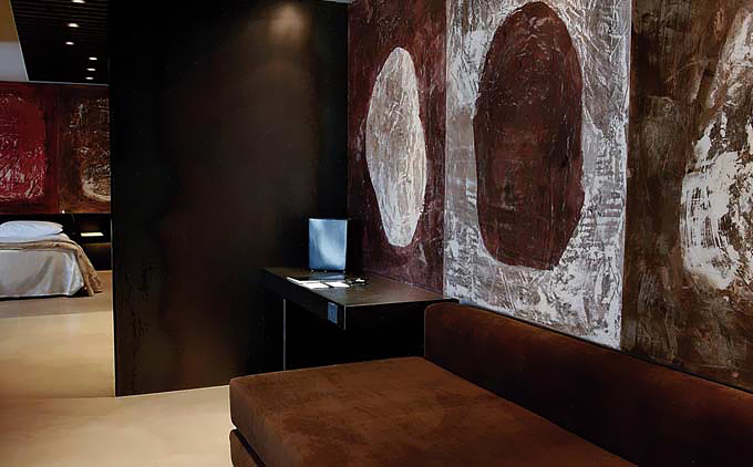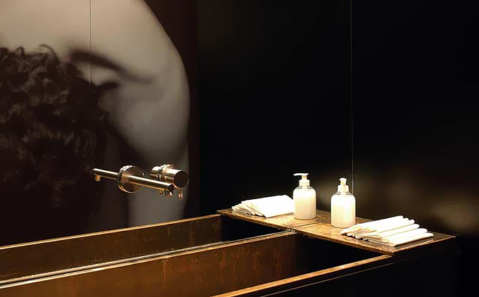 酒店入口就可看作一个装置艺术作品,锈迹斑驳的厚重金属挑檐就像对室内装饰风格的预演。进入室内,大厅里天然光从玻璃采光天井直泻而下,固定在地面上的倒L造型结构既是咖啡桌也是一款独特的灯具。大厅旁,黑白分明的餐厅中强烈的灯光制造的光影让装饰品上凹凸的肌理表露无遗。