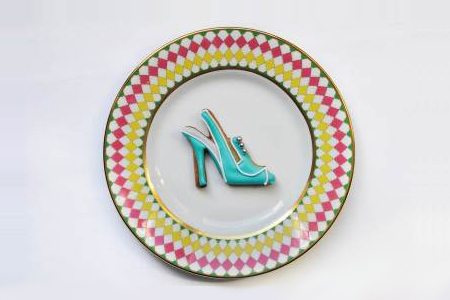 Manolo Blahnik的朱古力饼干配粉蓝色糖霜露跟鞋,上面缀以经典的珍珠