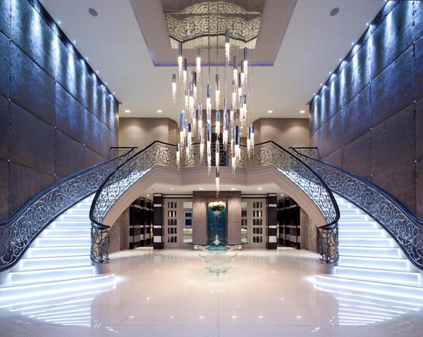 整个庄园占地近1000平米,主别墅分为3层,内部细节更是奢华得令人咋舌。推开神秘的大铁门,映入眼帘的是如梦似幻的入口大厅,两侧的弧形阶梯仿佛透着淡淡荧光的自然冰层,倾泻而凝滞在闪亮如镜的乳白色大理石地面上,并永无止境地延展开来;四周高墙则仿若结了冰层的高耸岩石,错落排列的暗灯打造出溶洞的氛围。更不可置信的是厅顶中央的水晶大吊灯,怎能不令人联想到夜空中划落的流星雨?这样看来,被称作私家入口大厅实着显得局限,五星级大酒店入口也未必会来得如此绚烂。
