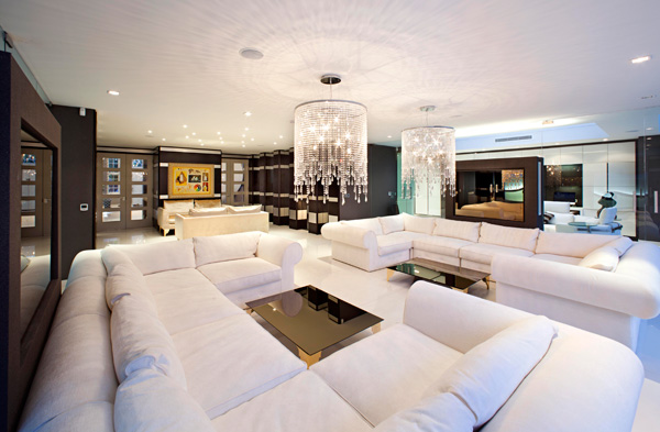 豪宅的其他房间也毫不逊色。大得不着边际的客厅中央奢享两个对称摆置的广角白色真皮沙发,上方分别悬挂的雨滴式水晶大吊灯不但奢味十足,更与四周的朱古力色墙壁冲撞出微妙的唯美意境。里侧的金色绒缎休闲沙发区配足了星点暗灯和音乐酒吧式格调。阶梯软席的私家影院厅奢无止境,8个真皮软椅都配有小照明灯,头顶中央的一条LED灯组仿佛银河,直通巨大的高清电影屏幕,现实与梦幻不再有边界。