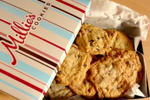 Millie's Cookies - 英国本土的cookie和muffin店,口味很多很丰富。硕大的可以做礼物送人的cookie“蛋糕”是他们的特色之一。