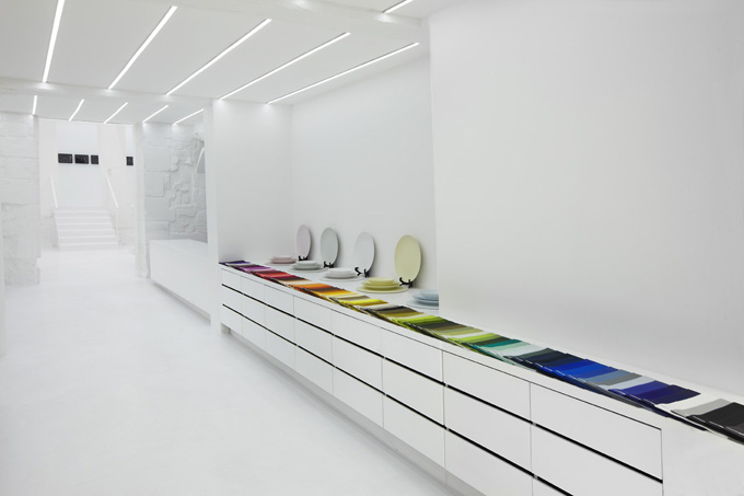 不加矫饰的干净空间,整洁有序的陈列,100种色调的桌布在全白环境里最大限度的呈现出完美形态。这种设计的微妙感,让整个店显得格外优雅。