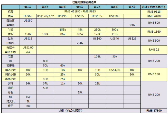 △ 包车:我们通过vivian代理订的是40US$一天(不过超10小时),半天是30US$(不过超5小时),外加小费15krp/人。网上有一些可能是35US$一天的,需要注意一下时长。注意在巴厘岛会有很多私人租车的,在马路上拉客,网上口碑很差,很多人被黑过,或者服务不好,除非迫不得已,尽量不要用吧。