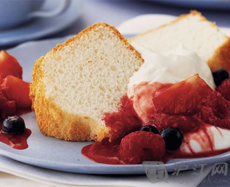 这种甜点是用蛋白做成的,完全不用蛋黄。在烘焙的过程中,它会慢慢在表层烤出漂亮的金黄脆壳,包裹着柔软、纯白色的蛋糕。这里我们用它搭配低脂酸奶和夏天的浆果,不过它和多汁的桃子、芒果或李子也很搭哦!