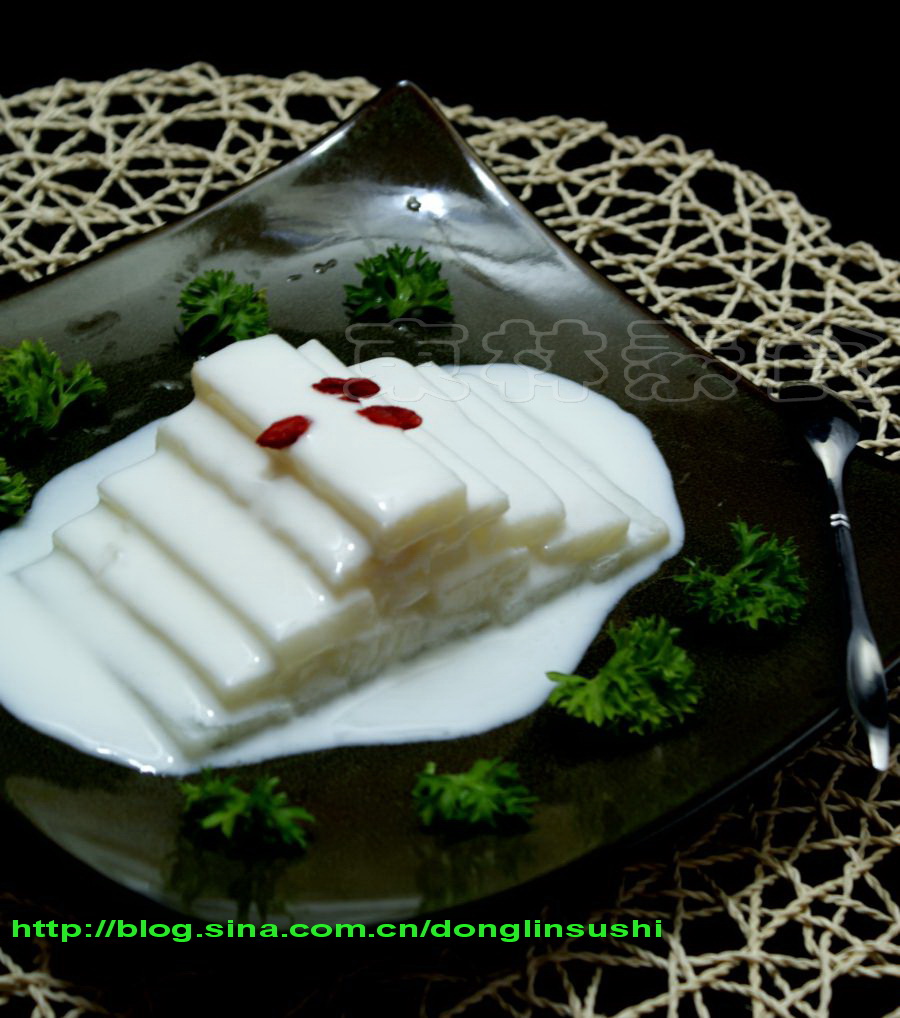 (2) 将晾凉的山药条入酸奶中拌匀,入冰箱中冷藏30分钟,取出,整齐的摆入盘内。在山药条面上淋入少许酸奶,用枸杞点缀即可。