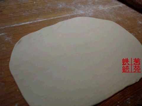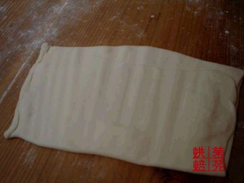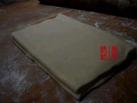 3.案板铺点面粉,将面团擀成皮子——长方形的,大约0.3cm厚。将玛琪琳放在正中间。