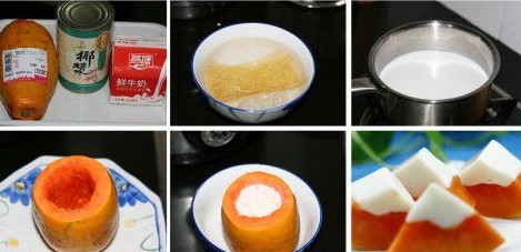 原料 木瓜一个, 椰汁半听,牛奶 100毫升,冰糖 20克,吉利丁片 2片